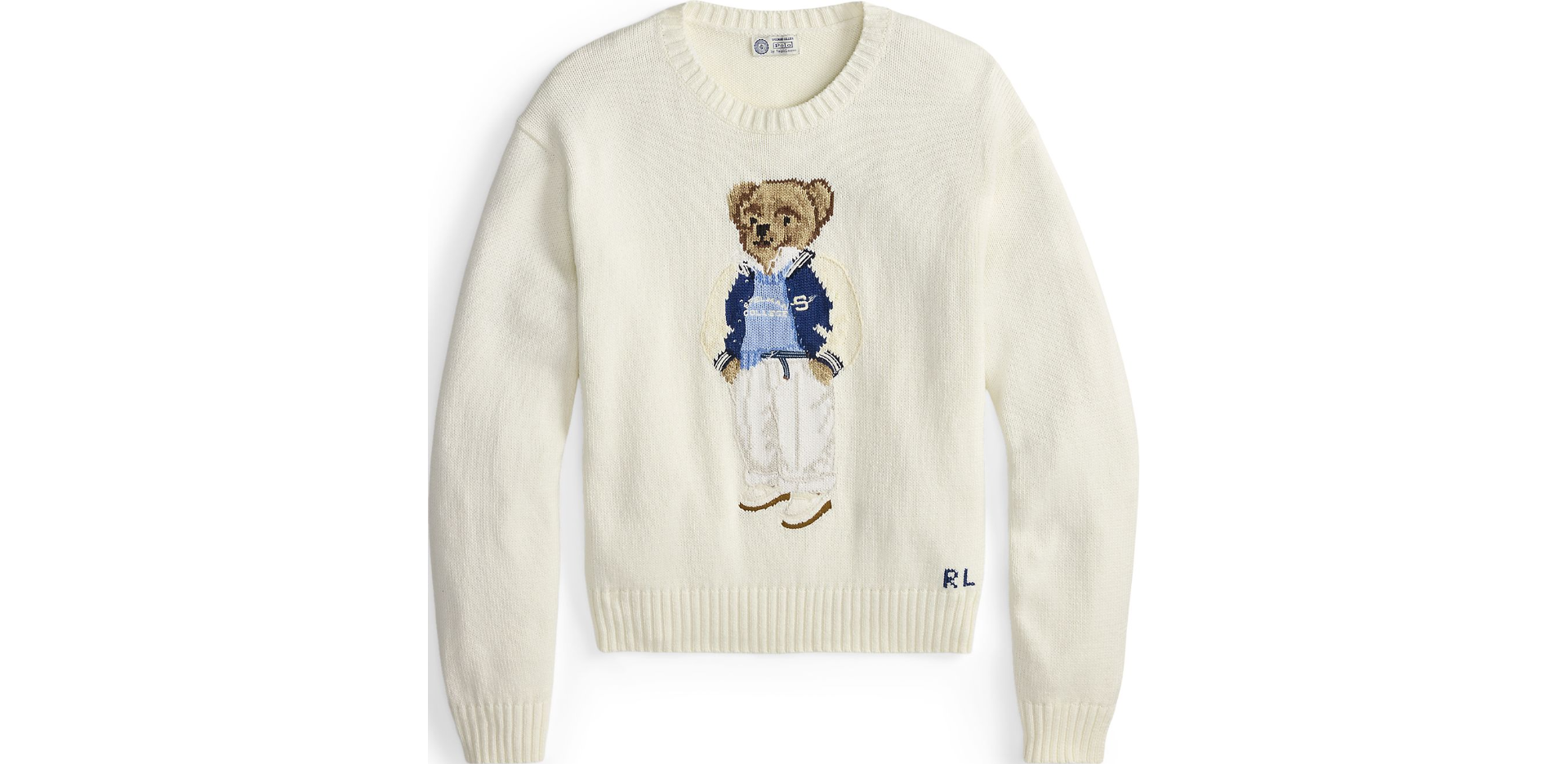 - Polo Bear intarsia-knit at the front. âSpelman Collegeâ embroidered on the Polo Bear's sweatshirt. âRLâ cross-stitched at the left hem.